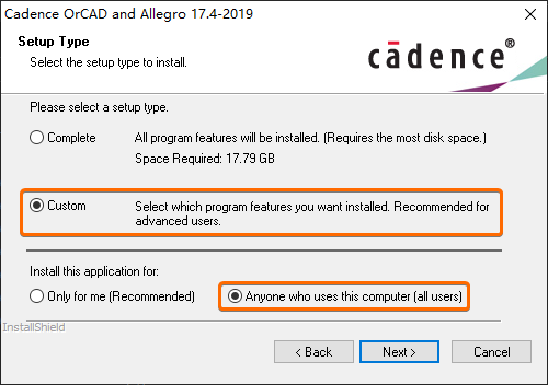 安装 Cadence OrCAD and Allegro 17.4-2019 套件的过程当中,需要勾选安装类型为【Custom】自定义安装,并且勾选为使用该计算机的所有用户安装(可以根据使用环境酌情选择):