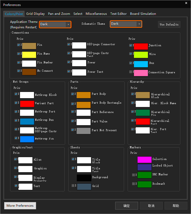 Preferences 对话框里,修改【Colors/Print】选项卡下的