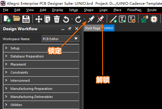 使用 Allegro PCB Editor 进行元件布局操作的时候,由于一些结构件和定位孔的位置固定,为了防止后期误操作,通常会使用锁定命令将其锁定。使用时需要鼠标先点击工具栏上的【Fix】和【Unfix】图标,然后再选择需要锁定或者解锁的元素: