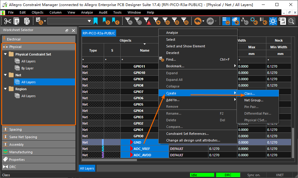 网络类 Class 通常用于依照功能模块对电路网络进行分类,鼠标依次选择 约束管理器窗口 左侧的【Physical -> Net】菜单项,然后使用【Ctrl/Shift + 鼠标左键】选中多个网络,再点击鼠标右键菜单中的【Create -> Class...】创建 Class 网络类: