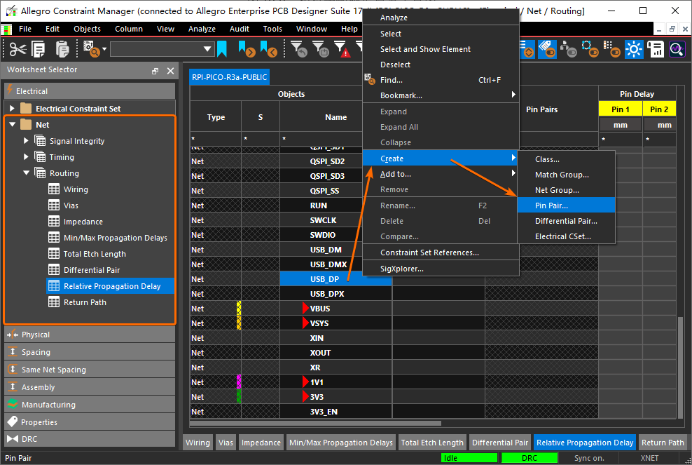 引脚配对 Pin Pair 通常用于等长布线操作,选择 约束管理器窗口 左侧的【Electrical -> Net -> Routing -> Relative Propagation Delay】菜单项,然后选中一条需要实现等长的信号线,再点击鼠标右键菜单上的【Create -> Pin Pair...】创建引脚配对: