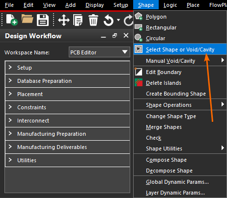 | 选择铺铜区域 | 点击菜单栏上的【Shape -> Select Shape or Void/Cavity】选项,然后再在 PCB 版图上执行选择操作。 |