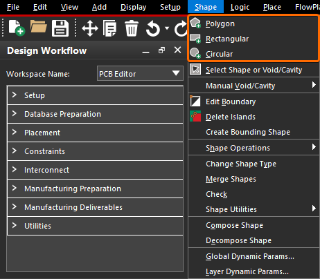 | 手动铺铜 | 直接点击菜单栏上的【Shape -> Polygon/Rectangular/Circular】选项。 |