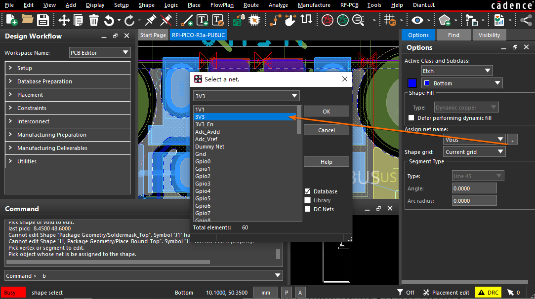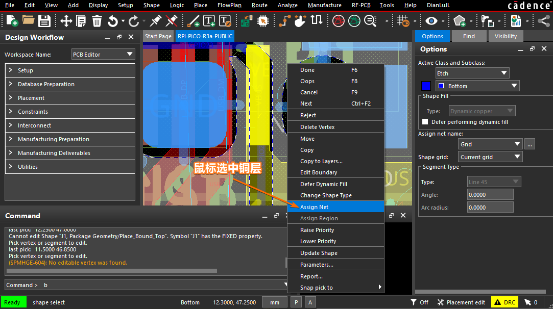 调整铺铜的电路网络,首先需要执行菜单栏上的【Shape -> Select Shape or Void/Cavity】命令,选择需要分配或调整网络的铺铜区域,然后点击鼠标右键菜单上的【Assign Net】菜单项: