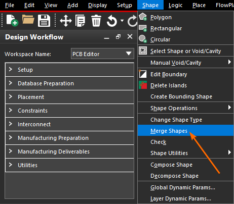 | 合并铺铜区域 | 选中铺铜区域之后,执行菜单栏上的【Shape -> Merge Shapes】选项。 |