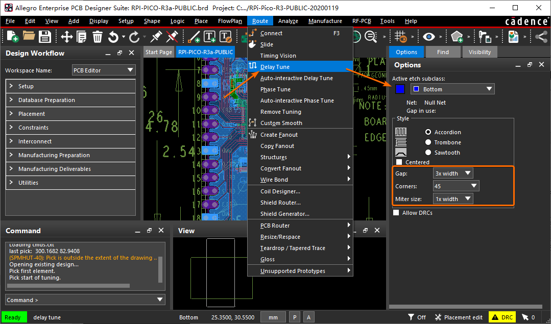 PCB 进行等长设计时,经常会使用到蛇形走线。首先执行菜单栏上的【Route -> Delay Tune】命令,然后就可以通过右侧的【Options】面板,配置蛇形布线的相关参数: