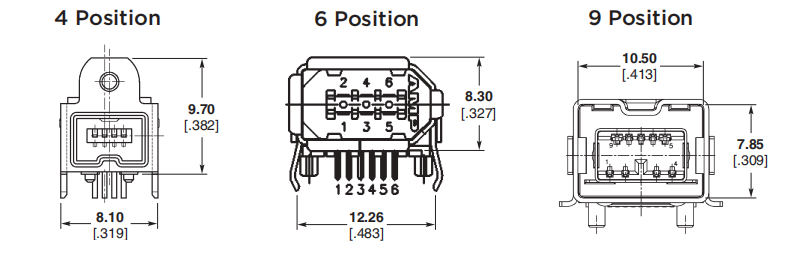 下图从左至右分别展示了简化掉电源引脚的 4 Pin 引脚的 Mini IEEE1394a 连接器、6 Pin 引脚的标准 IEEE1394a 连接器,以及 9 Pin 引脚的 IEEE1394b 标准连接器。
