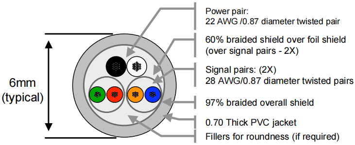 芯传输线缆,其外层为屏蔽层,内置有两对双绞线(分别用于传送数据和时钟信号),以及一对电源线(电压范围